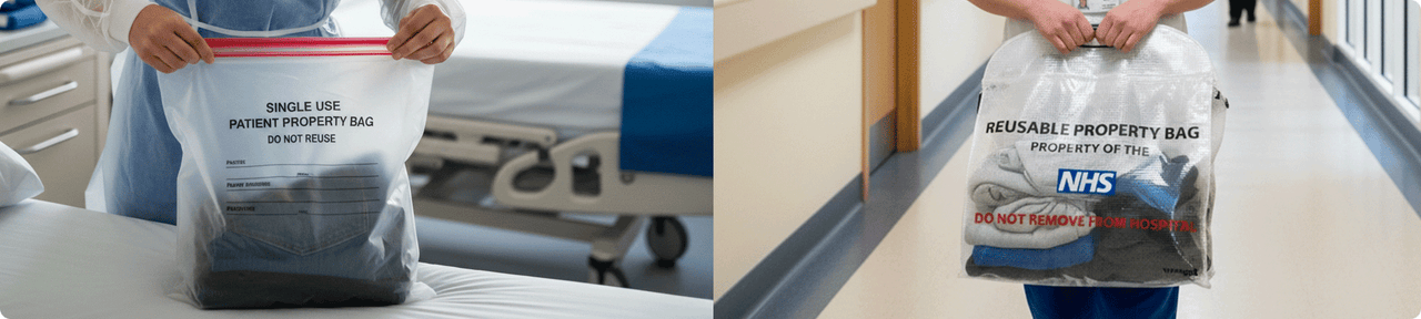 Compare single-use patient property bags with Versapak reusable alternatives.